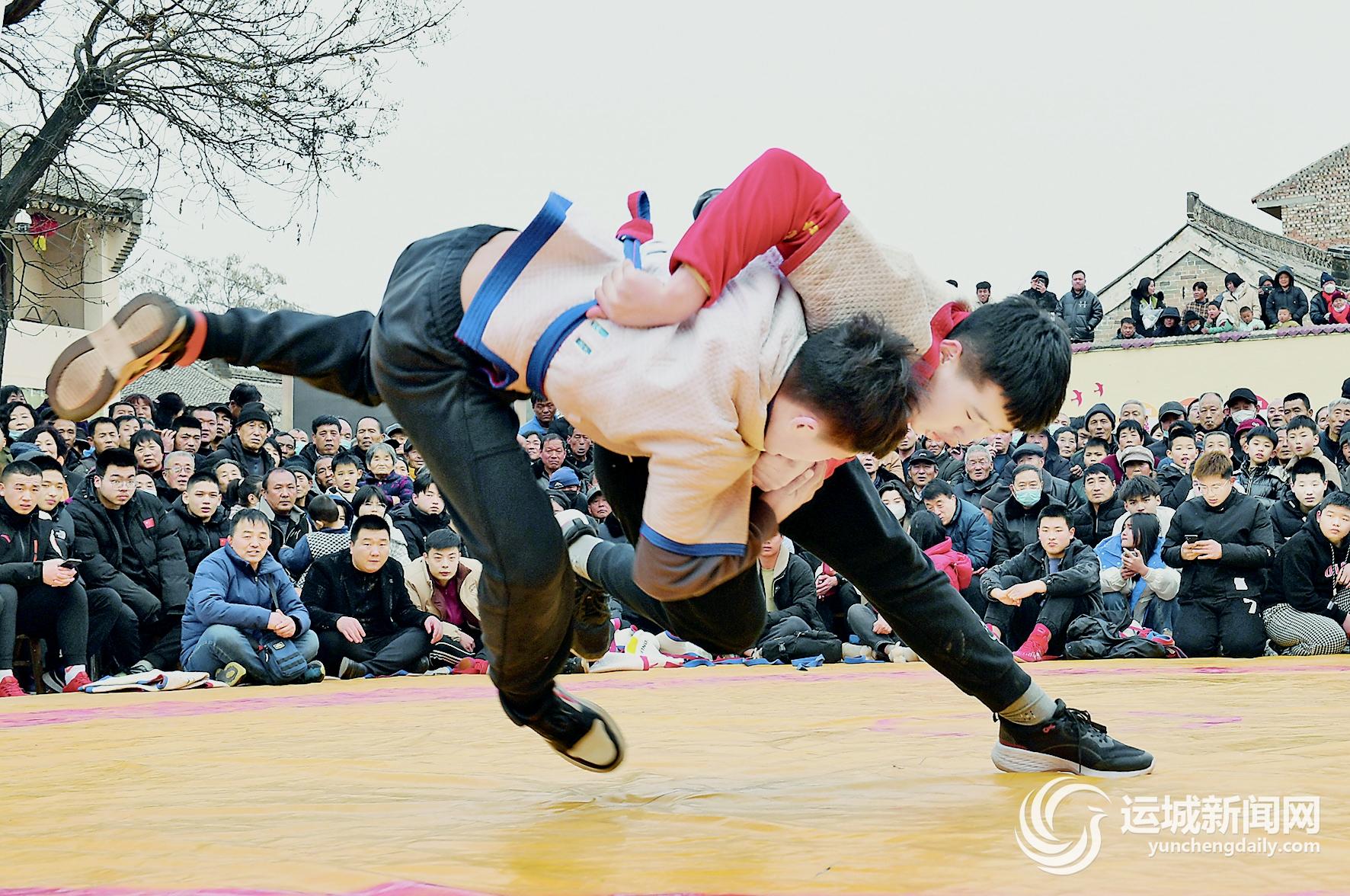 ▲2月2日,两名摔跤手在稷山县传统摔跤挠羊赛上进行激烈角逐。当日,稷山县传统的“摔跤挠羊”闹新春比赛在该县稷峰镇下廉村举行,来自太原、临汾、运城等地100多名摔跤爱好者参赛。特约摄影 栗卢建