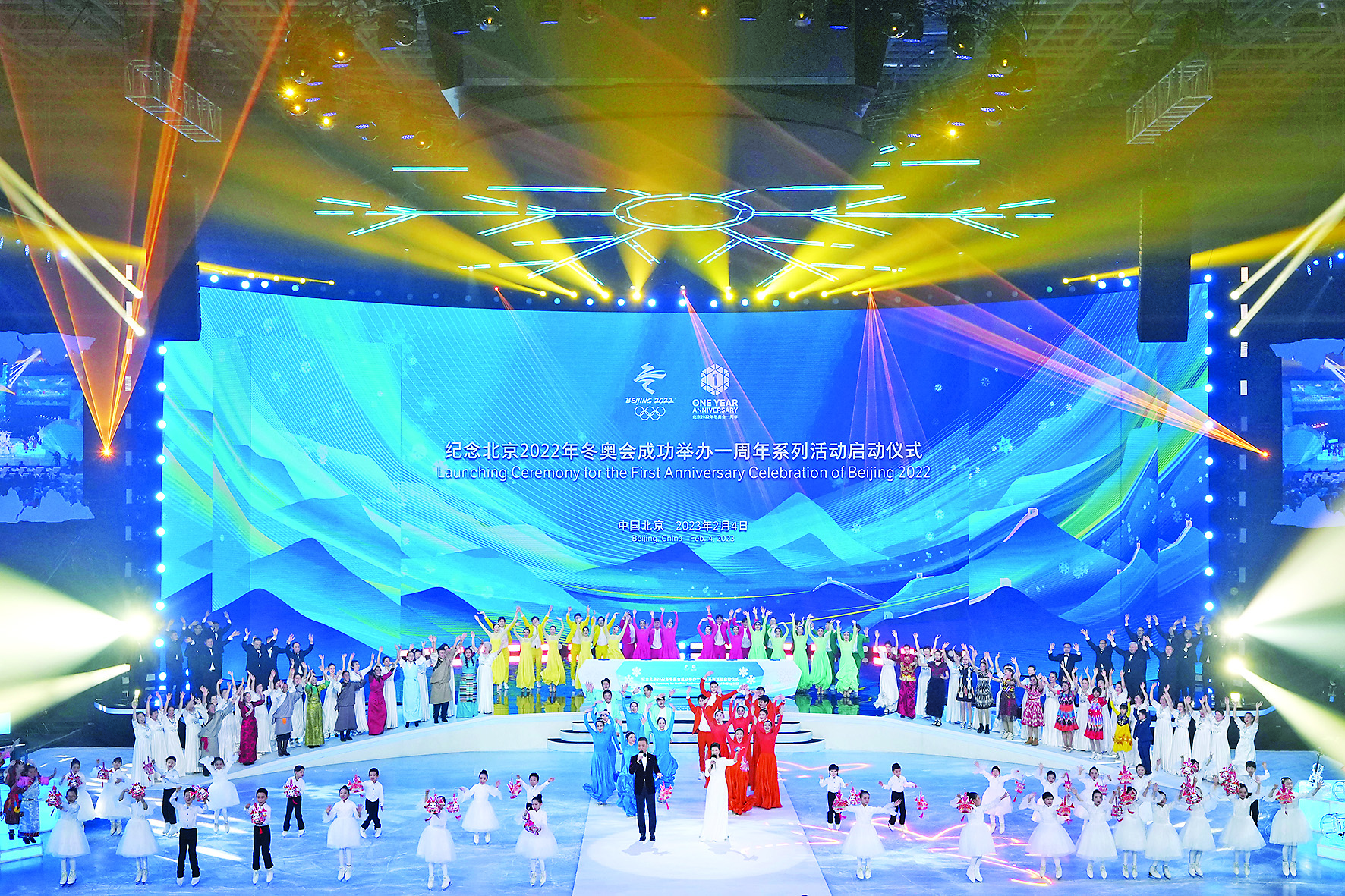 “雪花,雪花,开在阳光下……”2月4日晚,在北京2022年冬奥会开幕一周年之际,北京首钢冰球馆响起了主题歌《雪花》。“纪念北京冬奥会成功举办一周年系列活动”启动仪式在这里举行。