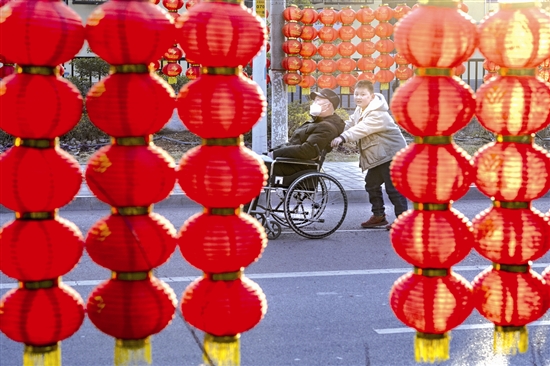 元宵佳节将至,我市各地观赏灯笼的群众逐渐增多。日前,记者看到,三门峡市区一些公园、街道、企事业单位门口都挂上了造型各异的灯笼,处处洋溢着浓浓的节日气氛。图为元宵节前夕一位孩子推着爷爷在涧河公园里赏灯。 记者 杜杰 摄