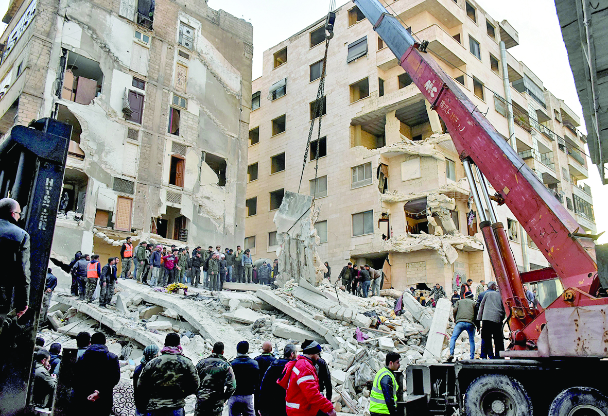 ▲2月6日,人们在叙利亚哈马省一处倒塌的建筑上进行救援。 新华社发
