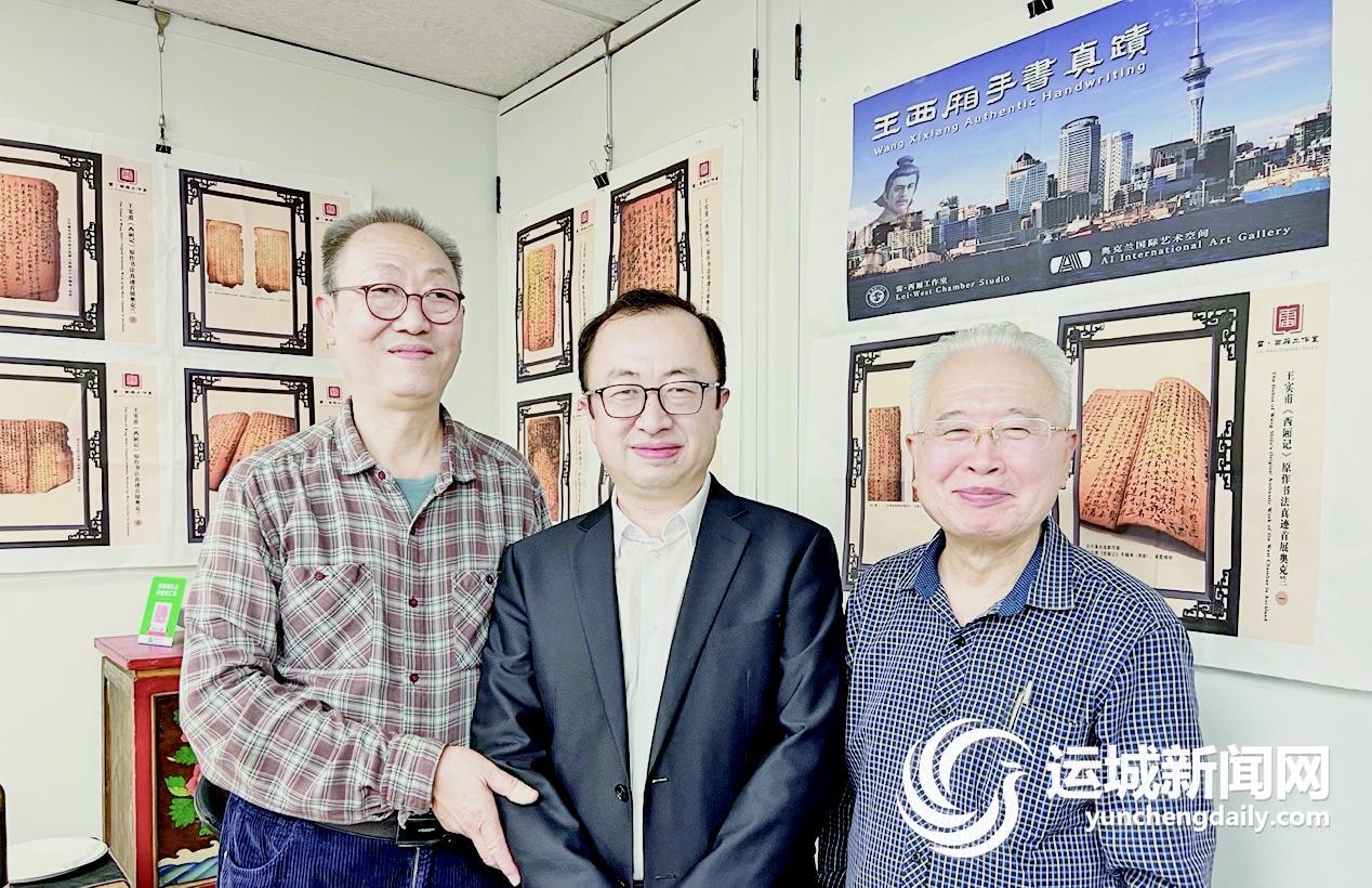 ▲西厢文化学者雷建德与奥克兰中国文化中心主任王建文(中)、新西兰中国国学教育委员会主任委员兼新西兰孔子学堂校长王義之(右)在展览现场