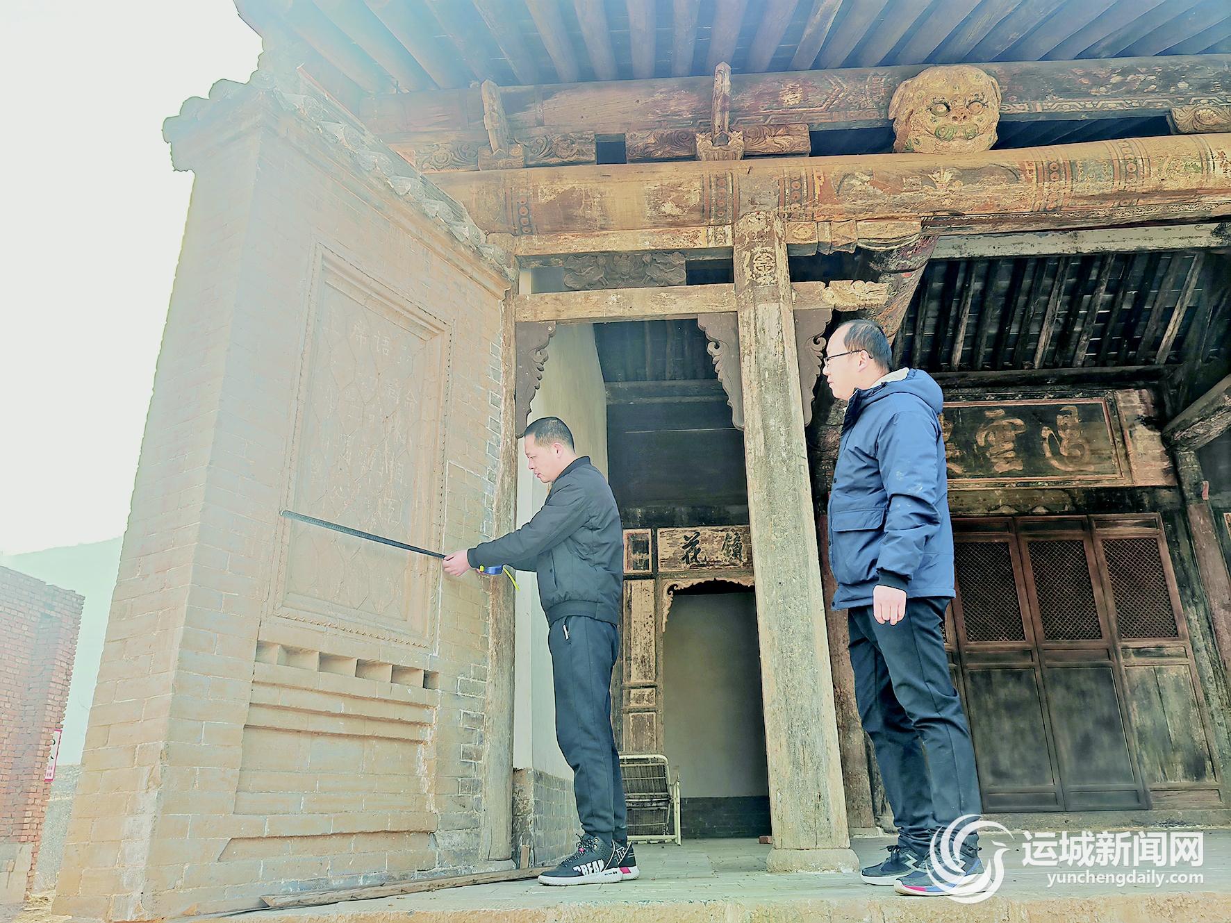 ▲永济市文物保护中心工作人员测量红色标语类革命文物
