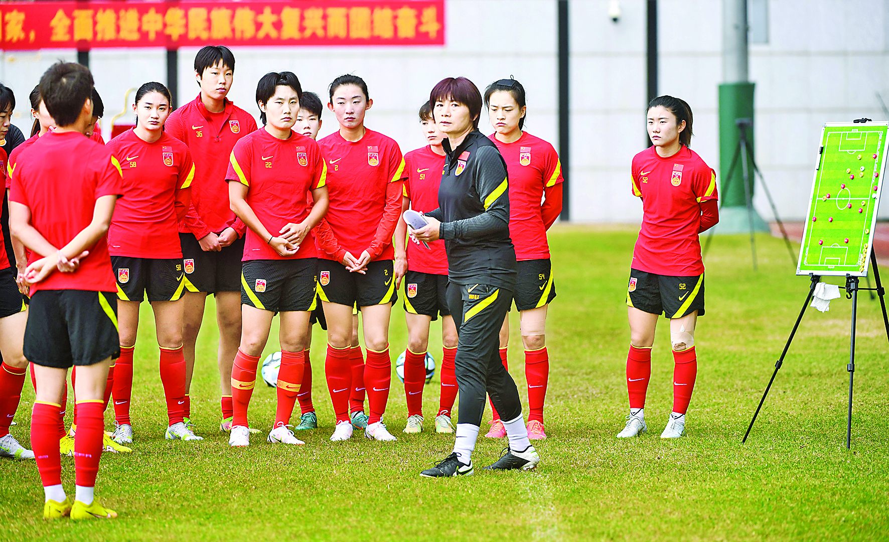 2月7日,中国女足主教练水庆霞(右三)在训练中指导球员。