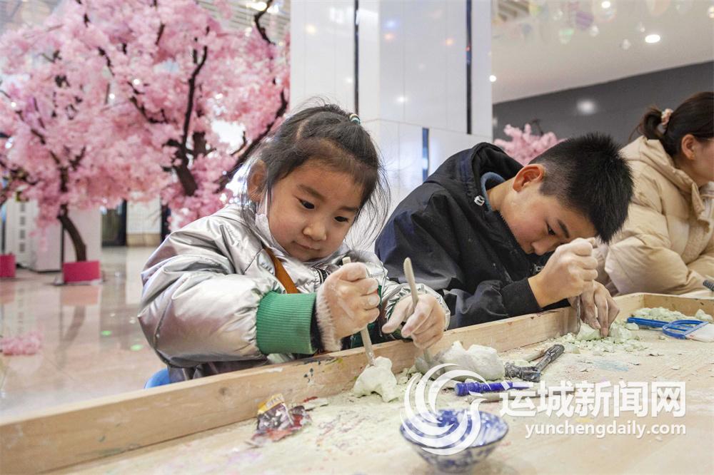 2月11日,在市区苏宁商场内,小朋友们在玩“考古探秘”游戏。