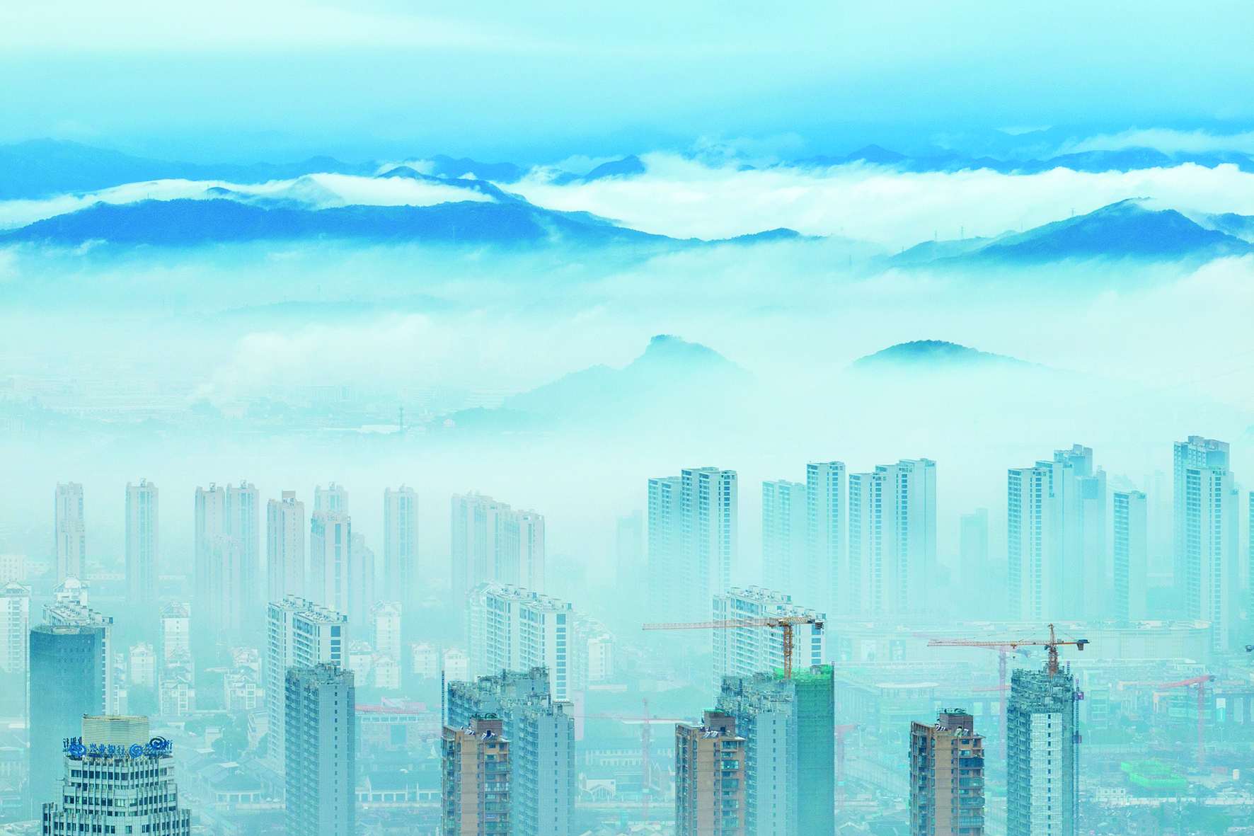 当日,椒江区雾气像一层层薄纱将山川、河流、城市笼罩,朦朦胧胧,犹如一幅美丽的生态城市画卷。
