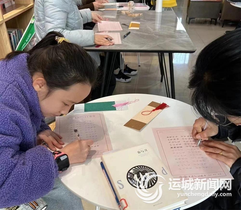 运城晚报讯(记者 寻霄)2月11日,河东书房·广电示范馆举办了《诗经》研学及临摹活动,15组家庭齐聚书房,在老师的带领下读诗、写诗、制作新年心愿书签(上图)。
