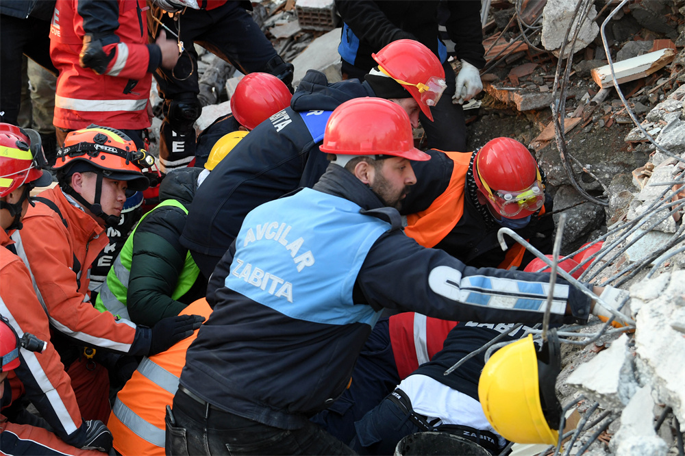 2月11日,包括中国救援队队员在内的救援人员在土耳其哈塔伊省安塔基亚市参与搜救。