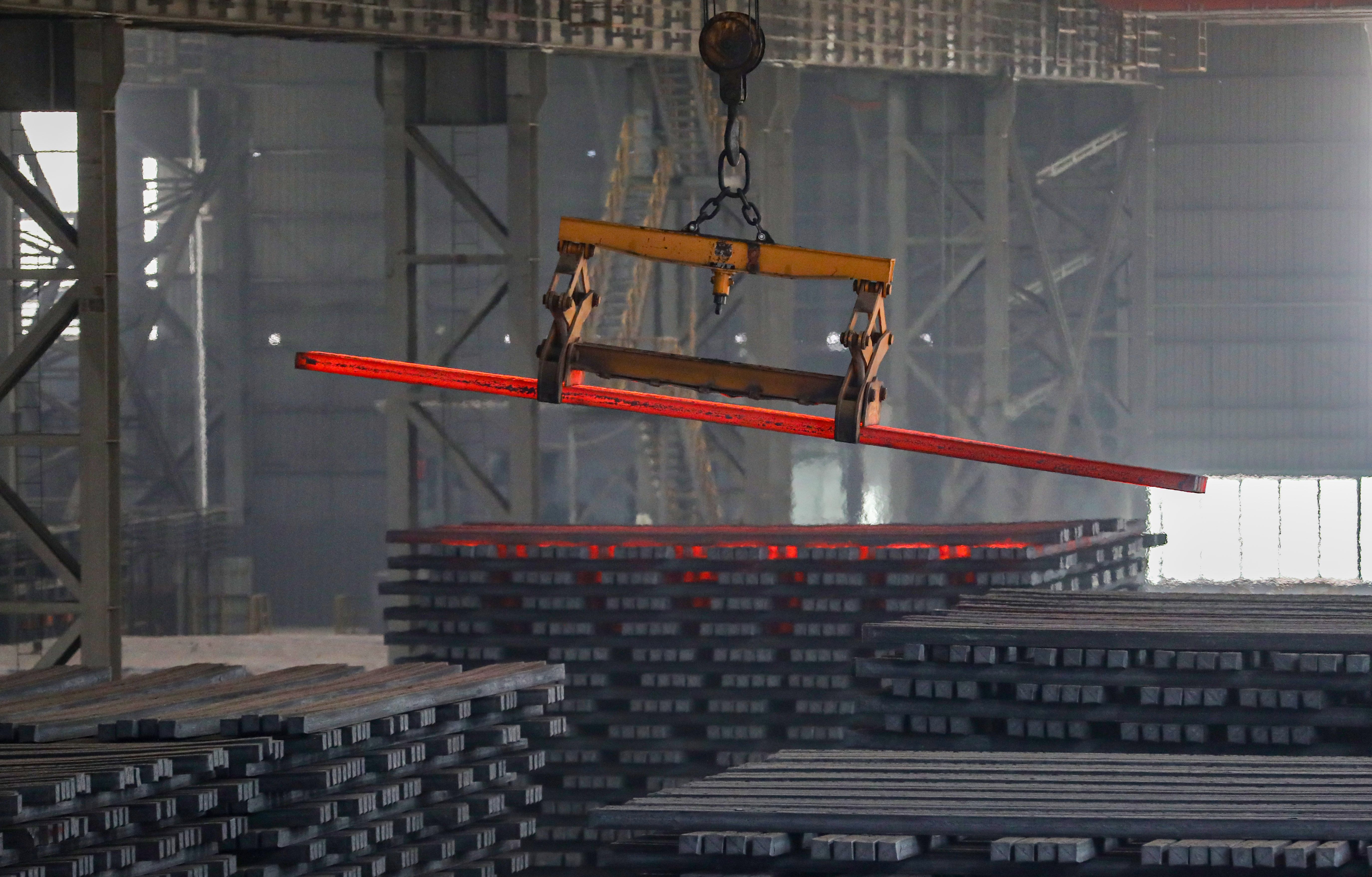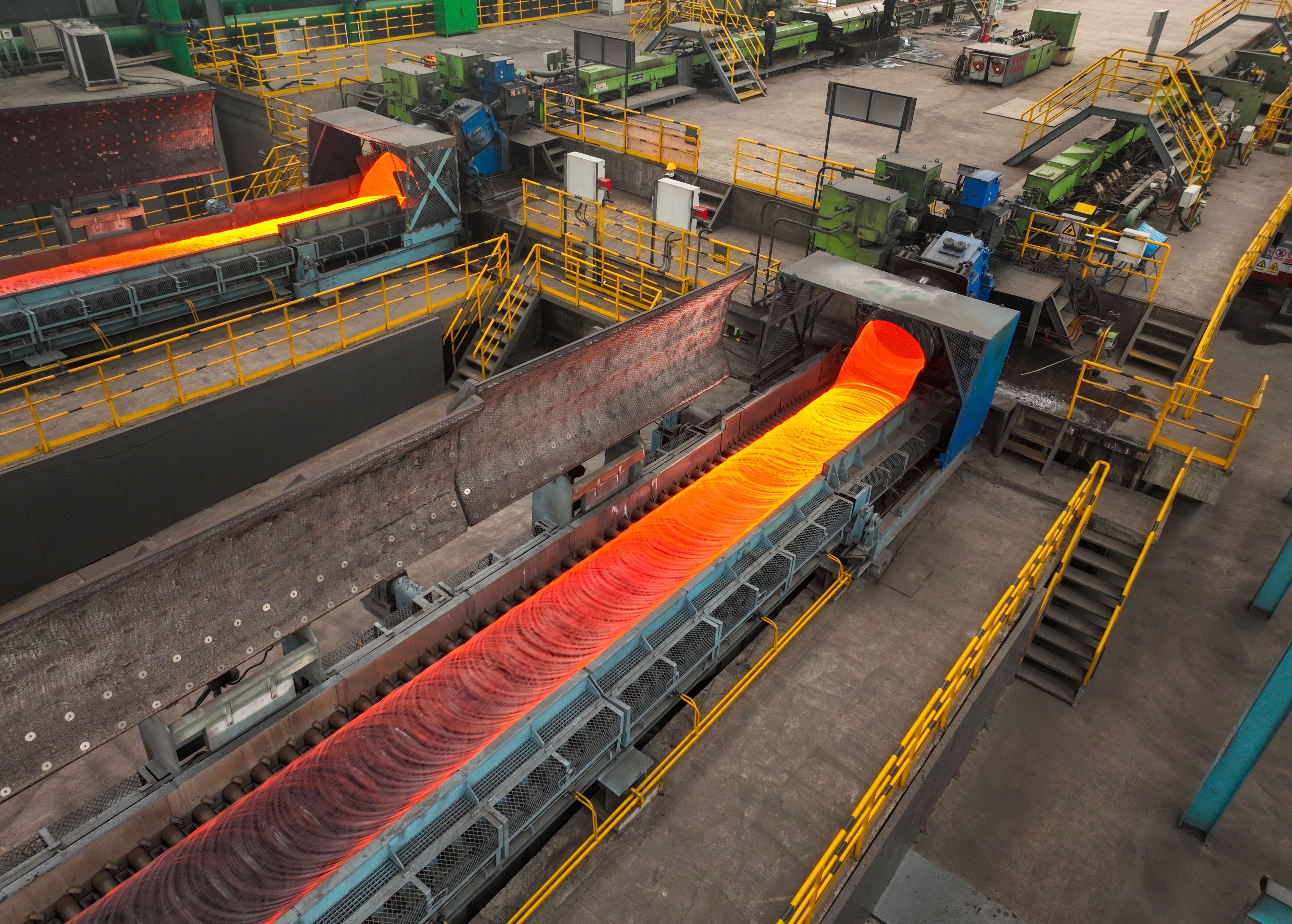 一根根长9米或16米、烧得火红的钢坯从炼钢厂出来后,通过耐高温的高速辊道,以61.6米/分钟的速度“冲向”轧钢厂。表面温度不低于930℃,符合轧钢条件,轧制开始……棒材、螺纹钢等产品被装上卡车销往全国各地。