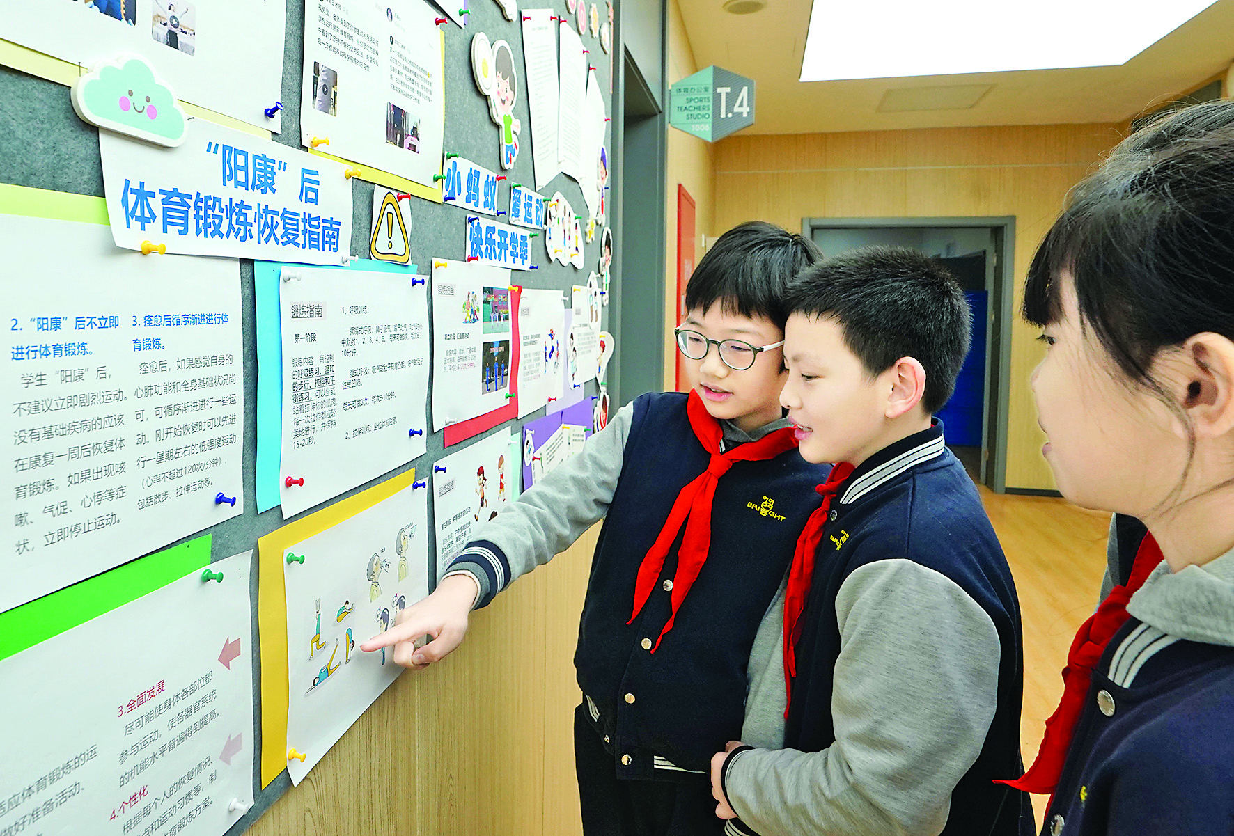 2月13日,在上海市长宁区天山第一小学,返校学生在走廊阅读新学期体育锻炼指南。