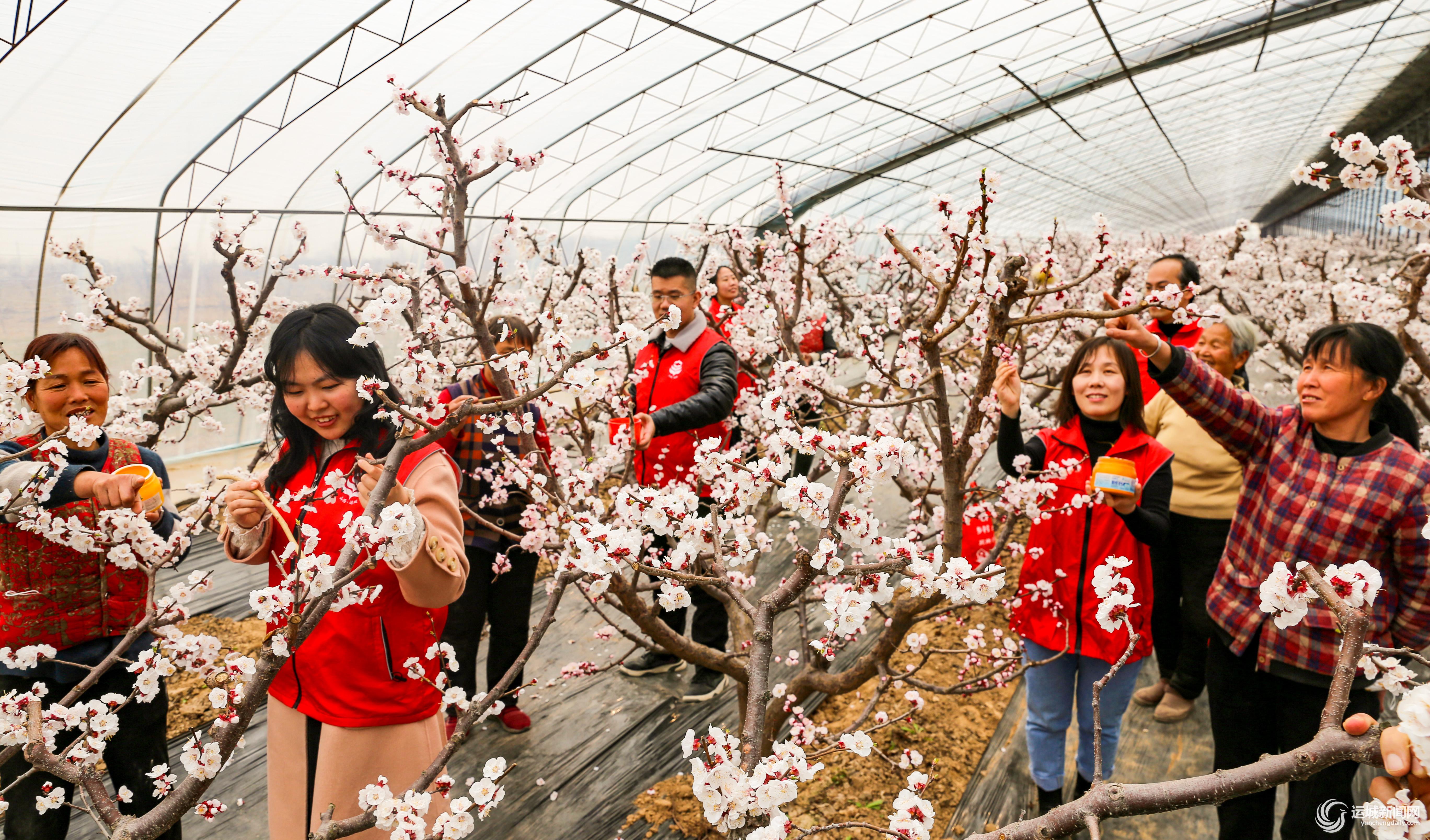 2月14日,夏县胡张乡新时代文明实践所的志愿者在西下冯村设施大棚里帮助杏农为杏花授粉。