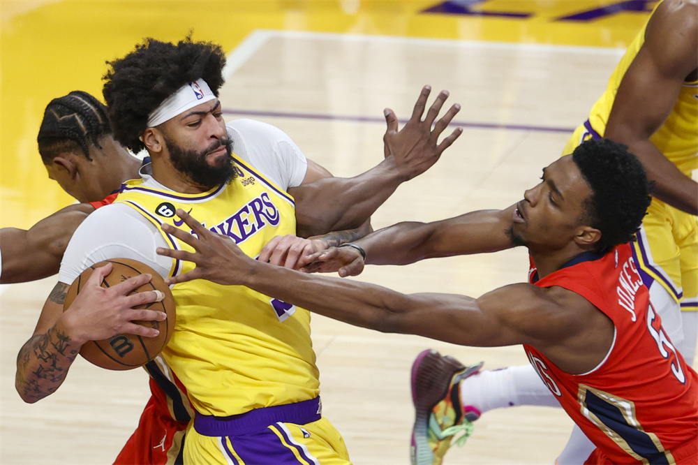 2月15日,湖人队球员戴维斯(左前)与鹈鹕队球员琼斯在比赛中拼抢。