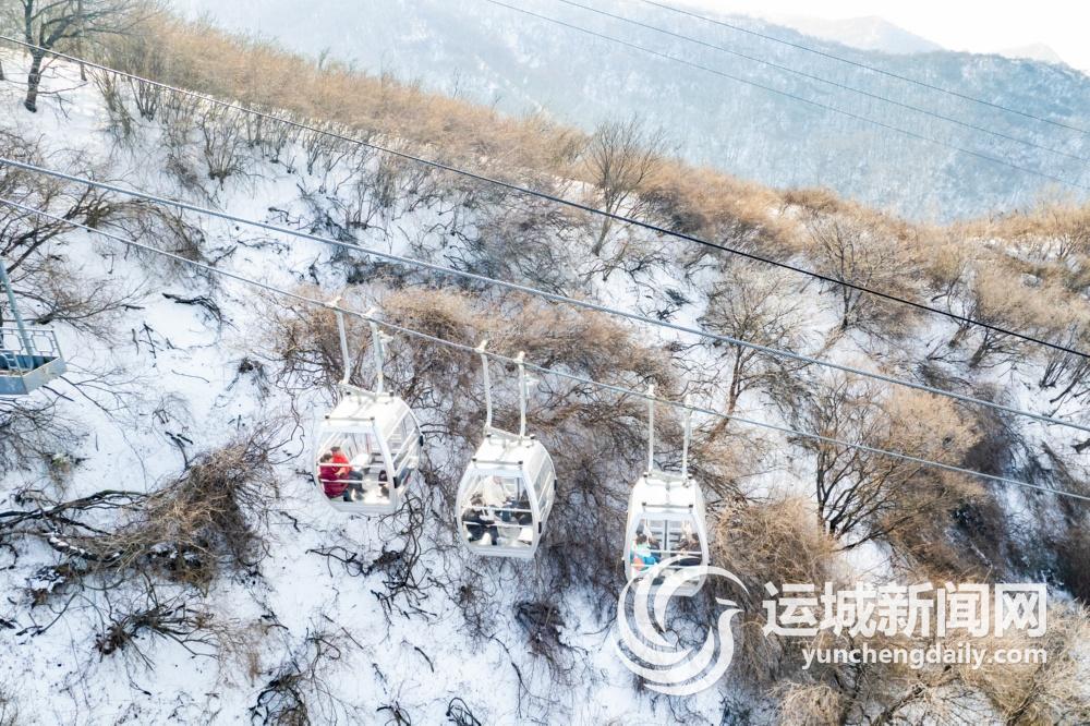 2月19日,盐湖区凤凰谷森林公园白雪还未消尽,游客乘缆车游玩。 本报记者 陈方斌 摄