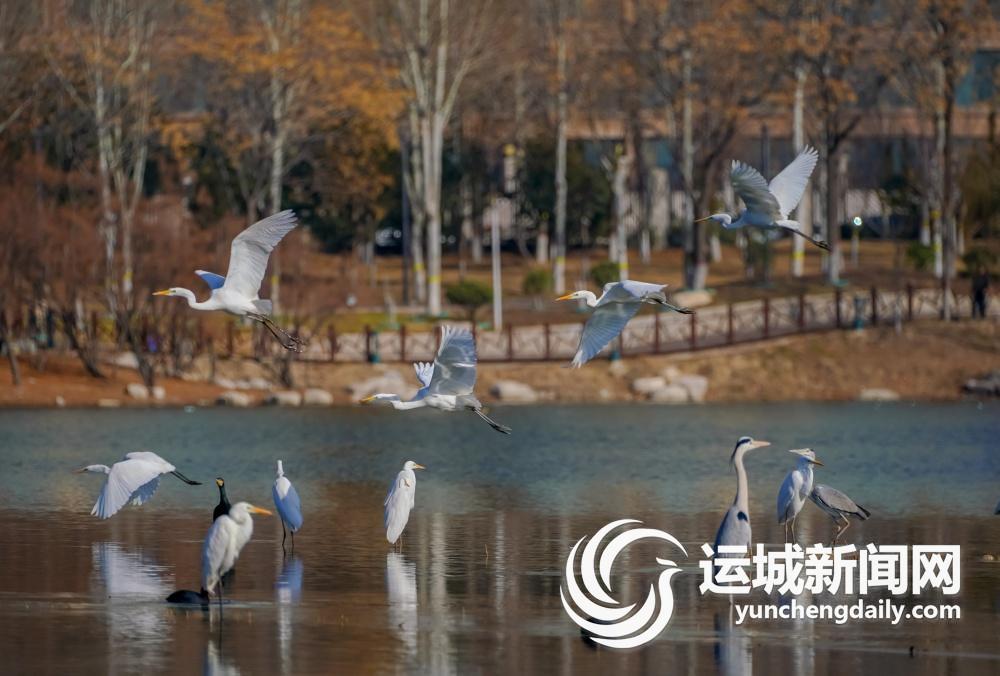 2月19日,中心城区禹都公园,几只白鹭时而在空中飞舞盘旋,时而在水中觅食嬉戏。