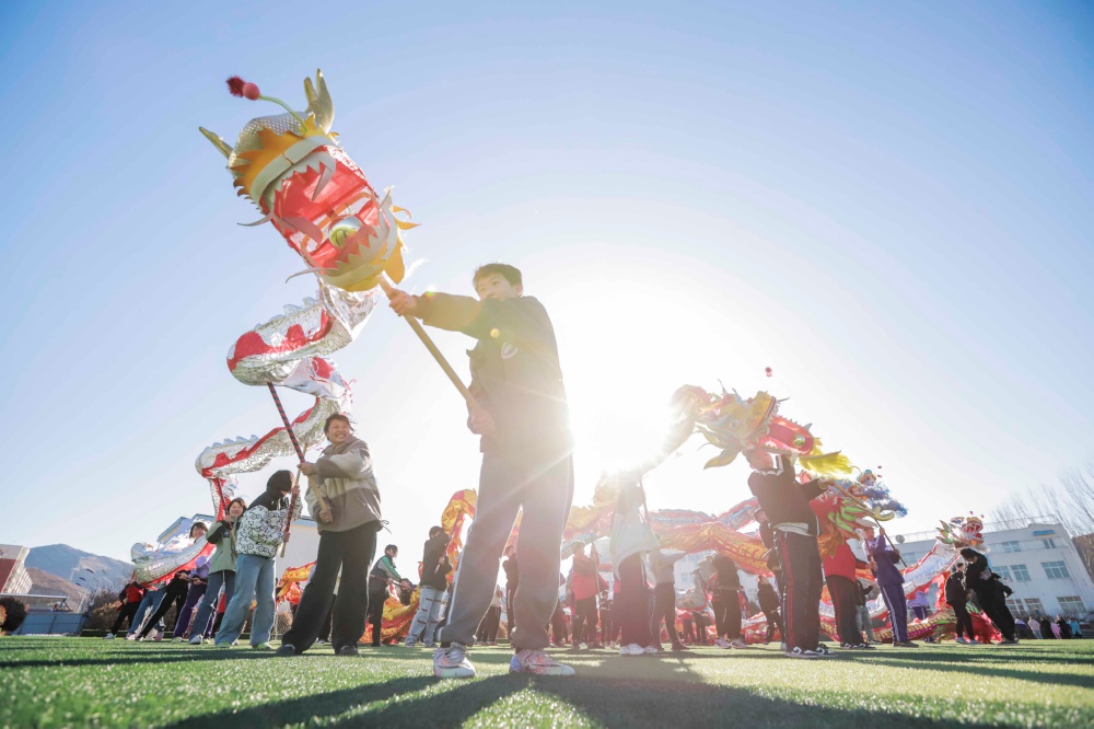2月20日,河北省遵化市东旧寨镇梁屯中心小学的学生表演舞龙。