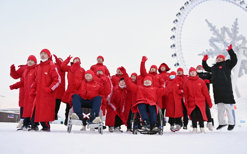 2023年2月9日,黑龙江省残疾人后备运动员集训队在第七届中国残疾人冰雪运动季北方主场活动现场合影。 新华社记者 李 贺 摄