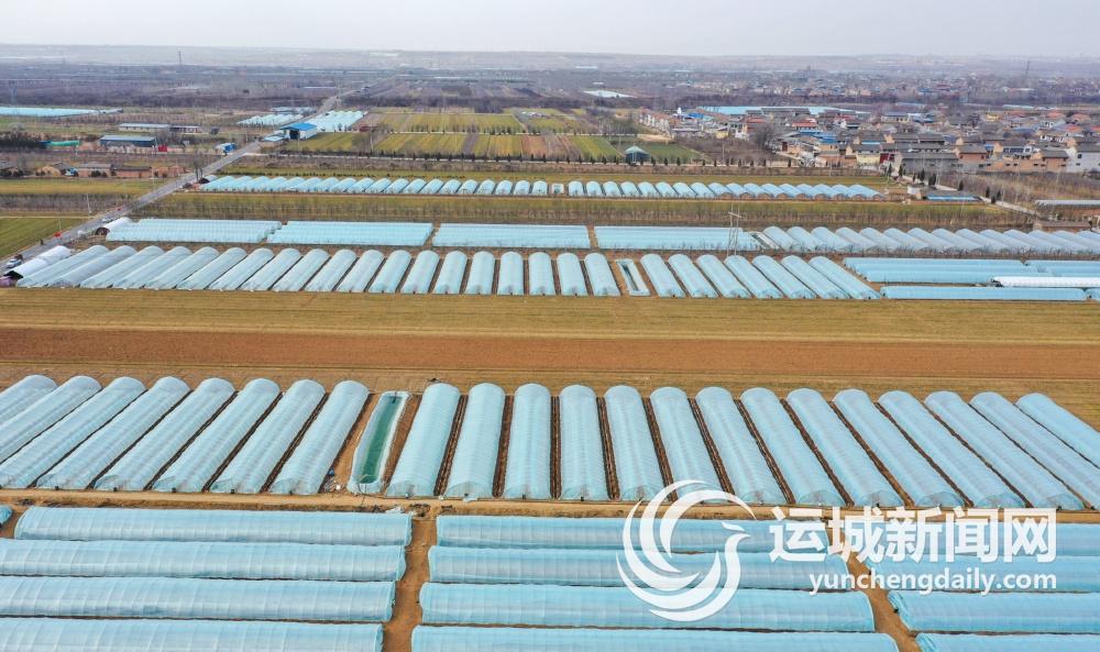 2月18日,俯瞰夏县广袤田野,整齐排列、形态各异的白色大棚与渐渐返绿的麦田、田间道路及树木、村庄等,共同构成一幅生机盎然的春天美景。