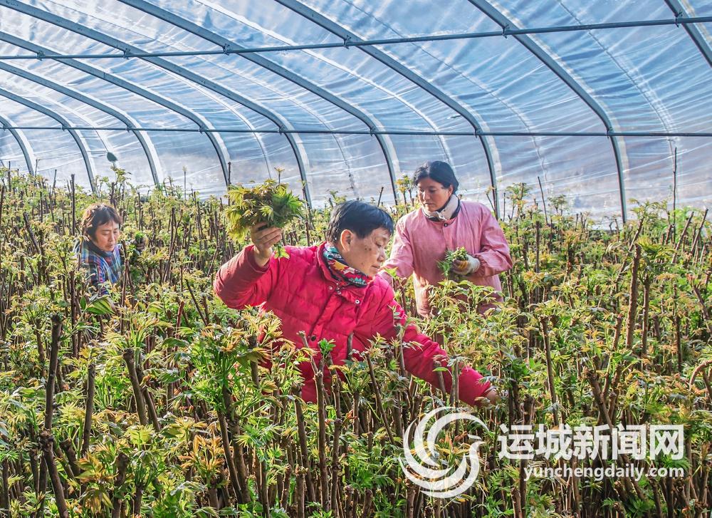 2月19日,永济市韩阳镇竹林村村民在香椿设施大棚里采摘香椿。当地利用时间差进行反季节销售,种植的香椿远销全国多地。