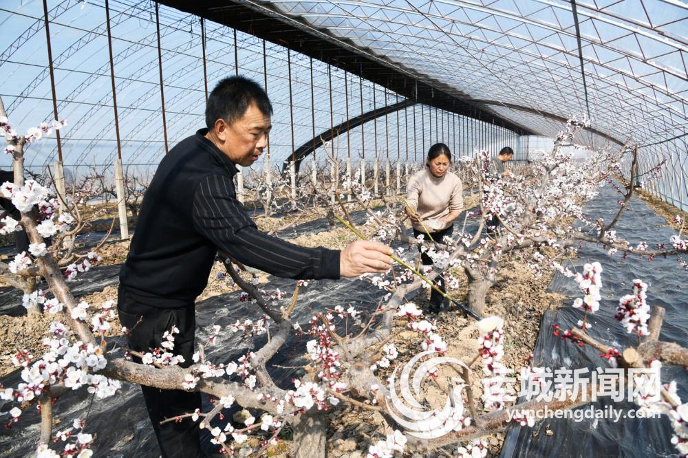 2月4日,闻喜县郭家庄镇宋店村村民在大棚里给杏花授粉。