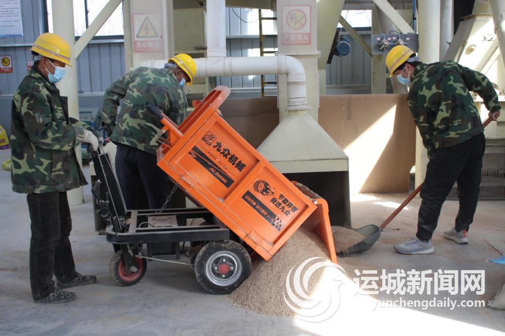 2月20日,闻喜县阳隅镇笃行村牛羊颗粒饲料厂员工在生产颗粒饲料。