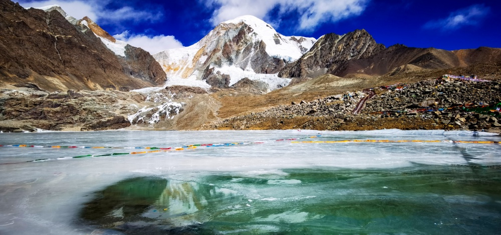 这是西藏拉萨市尼木县境内琼穆岗嘎冰川上的一处冰湖(2月20日摄)。琼穆岗嘎冰川气势恢宏,冰臼湖群点缀其间,湖水结冰后呈现出梦幻般的色彩,恍若仙境。 新华社记者 沈虹冰 摄
