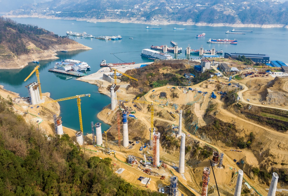 2月20日,工人在三峡库区湖北省宜昌市秭归县三峡枢纽茅坪港疏港铁路建设工地施工(无人机照片)。