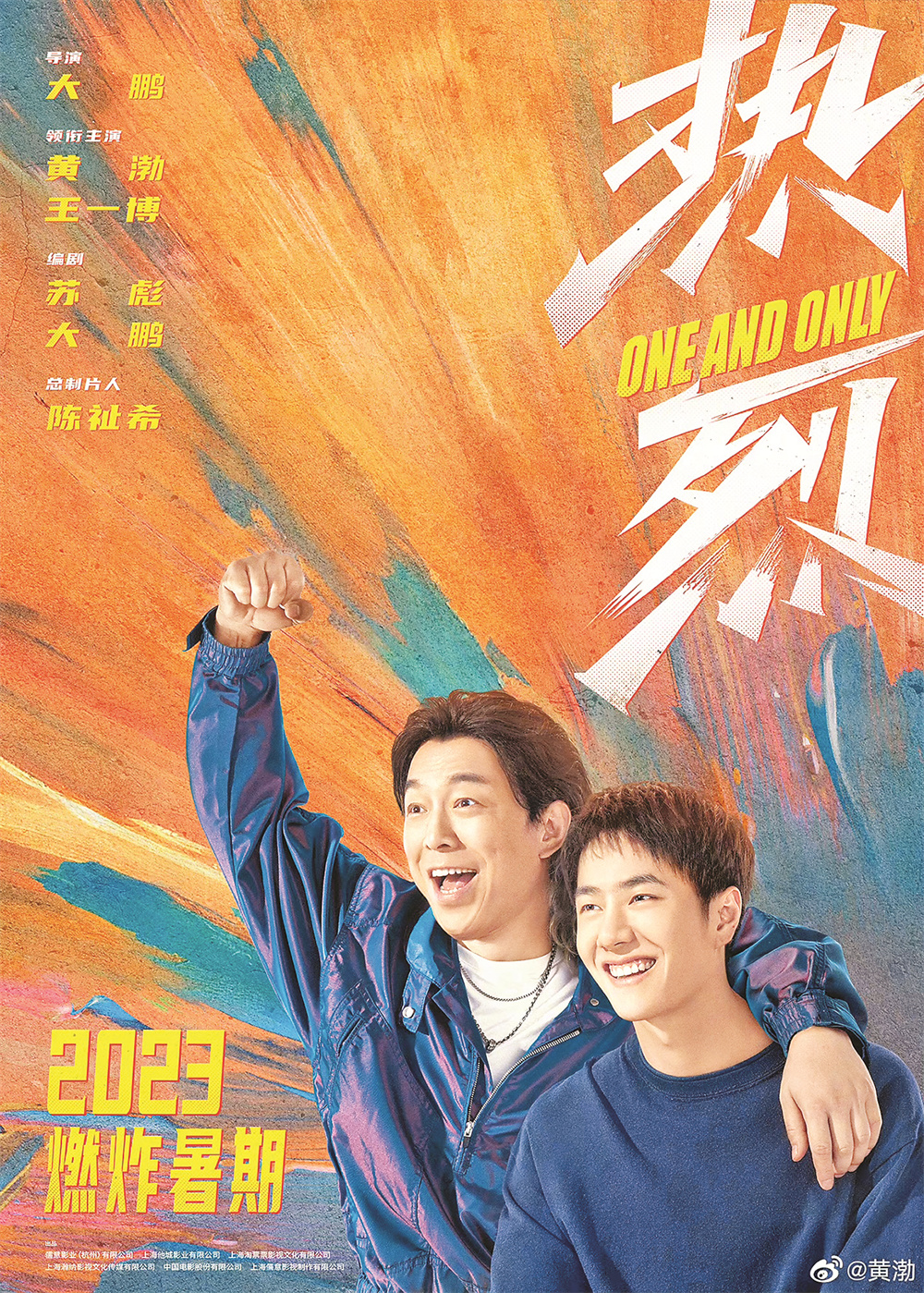 2月20日,电影《热烈》官宣定档暑期并发布“滚烫青春”版海报。影片由大鹏执导,陈祉希担任总制片人,黄渤、王一博领衔主演。海报背景明艳飞扬,像恣意的青春、挥洒的热血!两位主演黄渤、王一博搭肩大笑,笃定的眼神里透露着希望的光芒。
