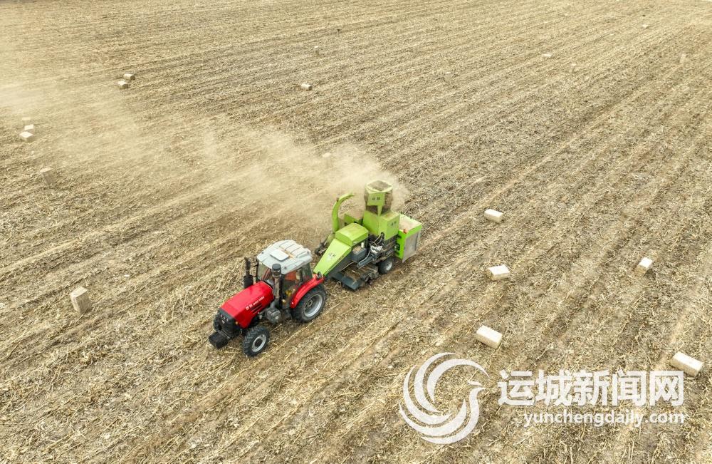 2月21日,芮城县东垆乡西南村的黄河滩地里,随着秸秆打包机驶过,玉米秸秆被打成秸秆包,从机器后身“吐出”,有效解决了秸秆露天焚烧的问题,实现环境效益和经济效益双赢。