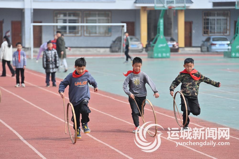 2月22日,广西蒙山县夏宜民族学校学生在体育课上滚竹环。