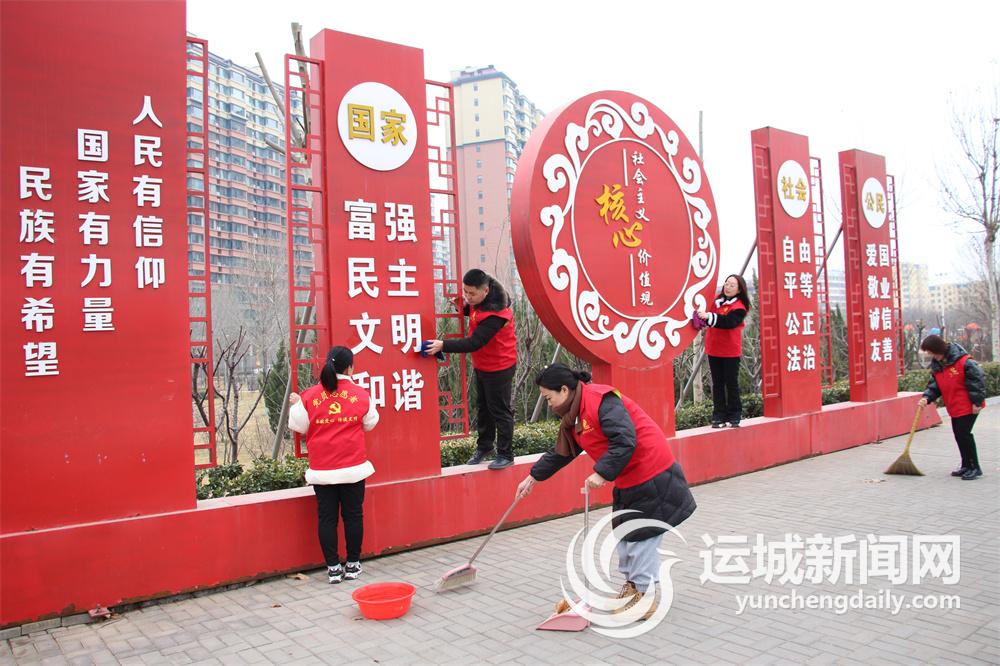 2月22日,闻喜县龙海社区工作人员与志愿者在该县体育公园等重点场所整治环境卫生,助力文明城市创建。