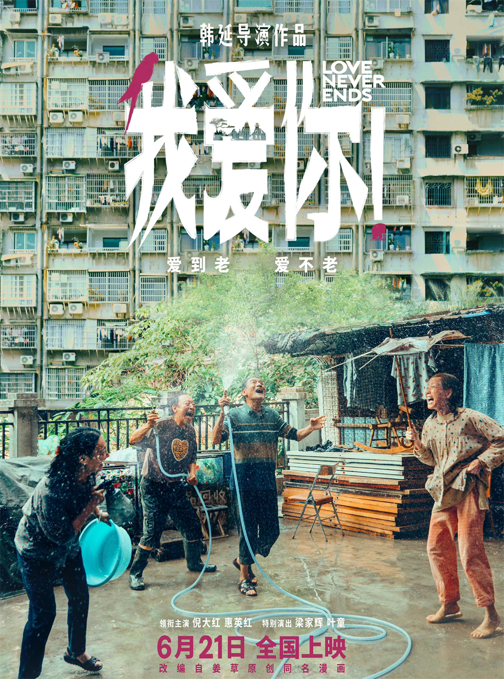 由韩延导演,倪大红、惠英红领衔主演,梁家辉、叶童特别演出的现实题材爱情电影《我爱你!》正式定档6月21日,并发布一款海报(上图)。影片改编自姜草原创同名漫画,温暖刻画了两对老人生命尽头勇敢而纯粹的爱情。