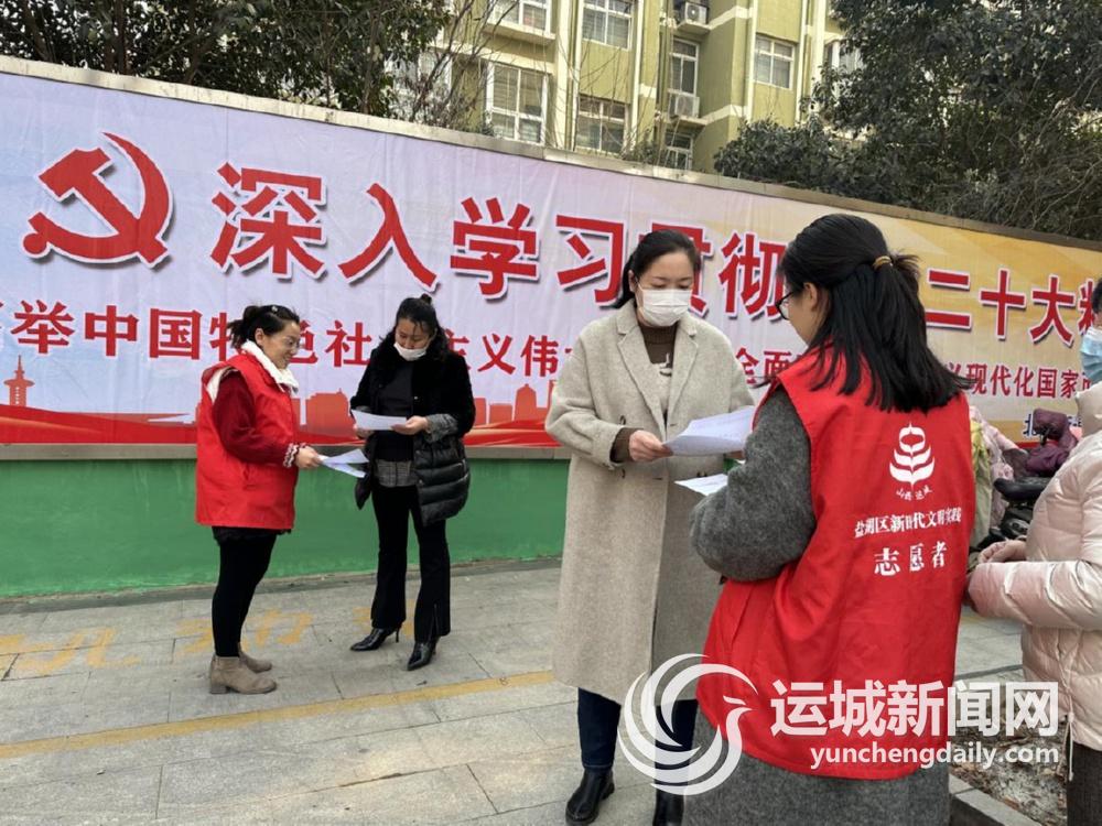 图为盐湖区北城街道四季绿城社区志愿者在社区内为居民发放党的二十大精神学习资料。