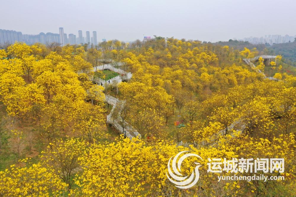2月23日,游人在广西南宁市青秀山风景区的风铃谷观赏绽放的黄花风铃木花(无人机照片)。