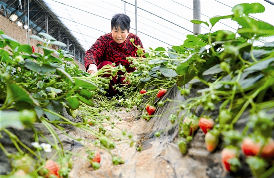 2月21日,在湖滨区崖底街道陈宋坡黄龙蔬菜草莓基地大棚里,农户正在采摘草莓。近年来,湖滨区充分发挥区位优势,因地制宜发展生态农业、休闲农业,打造集休闲、观光、采摘于一体的“近郊游”模式,有效促进了现代观光农业和乡村旅游融合发展,促进农业增效和农民增收。 记者 夏泽辉 摄