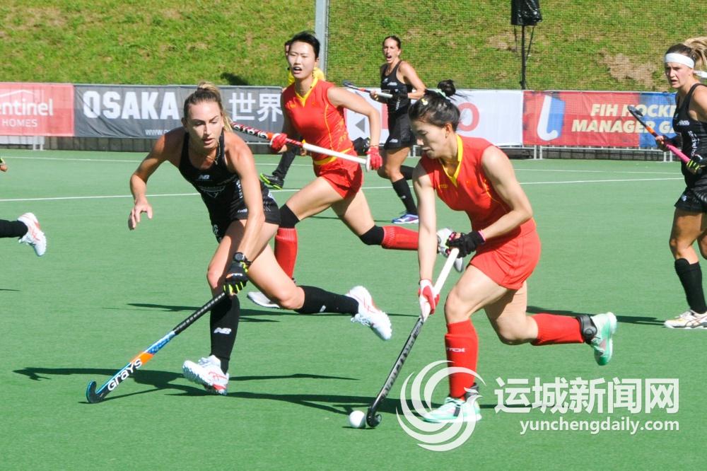 2月26日,中国队球员钟嘉琪(前右)在比赛中进攻。 当日,在新西兰惠灵顿进行的曲棍球世界女子超级联赛中,中国队以5比2战胜新西兰队。