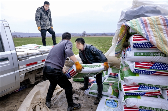 进入春耕春管时节,我市各地农村不误农时,抓紧对麦田开展施肥作业,确保今年夏季小麦再获丰收。图为近日,灵宝市西阎乡黄河滩涂的种粮专业户在搬运化肥,准备为麦田施肥。