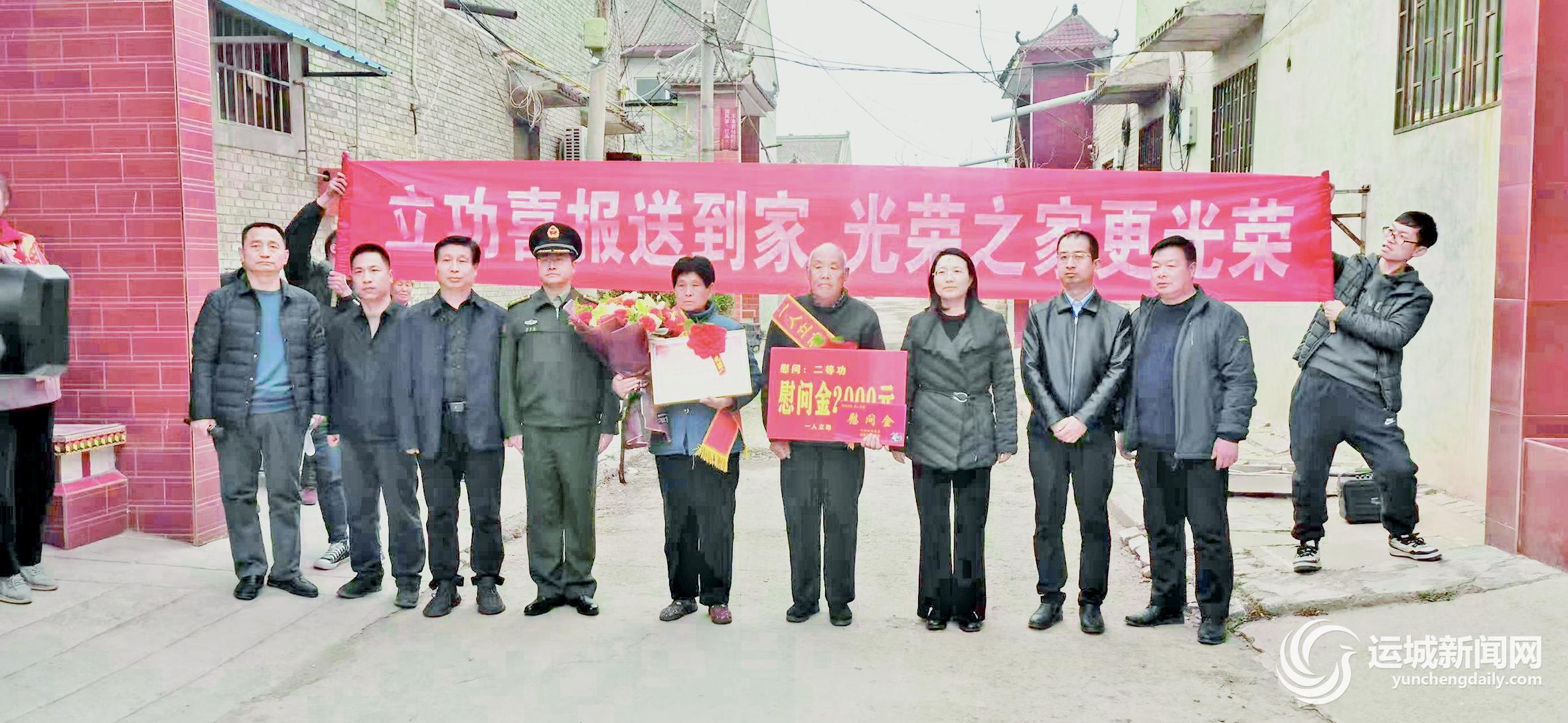 本报讯 近日,在铿锵有力、喜悦欢快的军乐声中,临猗县武装部部长、政委惠自强,副县长翟朝霞,以及县退役军人事务局、三管镇相关同志组成慰问团,专程到三管镇黄家庄村光荣军属、七旬老人黄启云、张春换夫妇家,送来其子黄建设荣获二等功的喜报、慰问金,亲手为二老献上红绶带,并详细询问家庭生活、身体情况,衷心感谢二老教子有方,培养的“空中骄子”对国防作出重大贡献,使在场村民受到一次爱国主义教育。