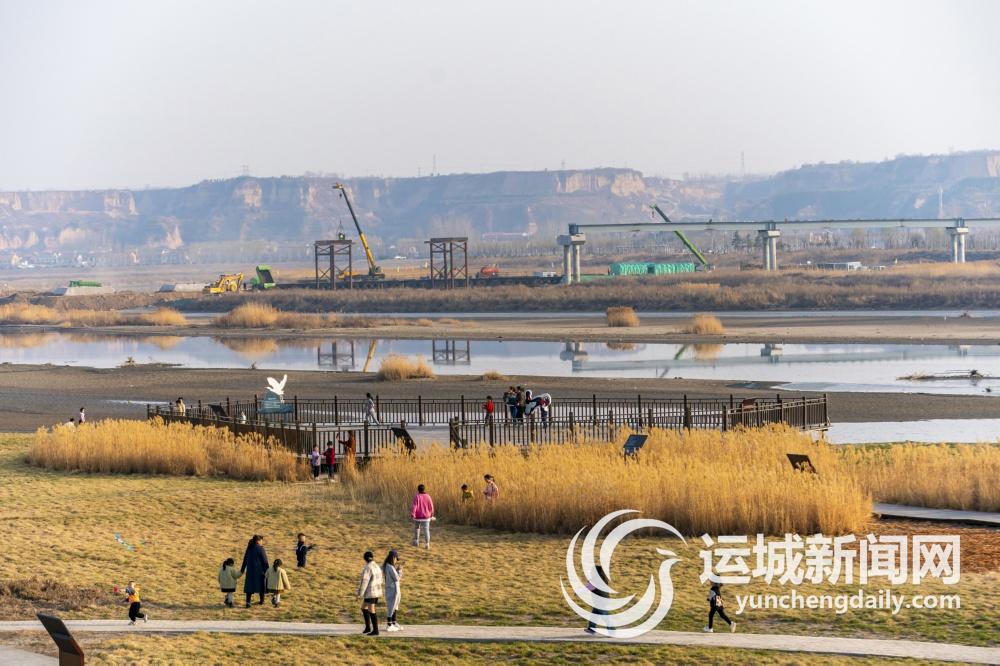3月7日,游人在稷山县汾河公园游玩,旁边的汾河两岸桥梁工程项目建设如火如荼,施工人员抓时间、抢进度,加班加点科学施工。