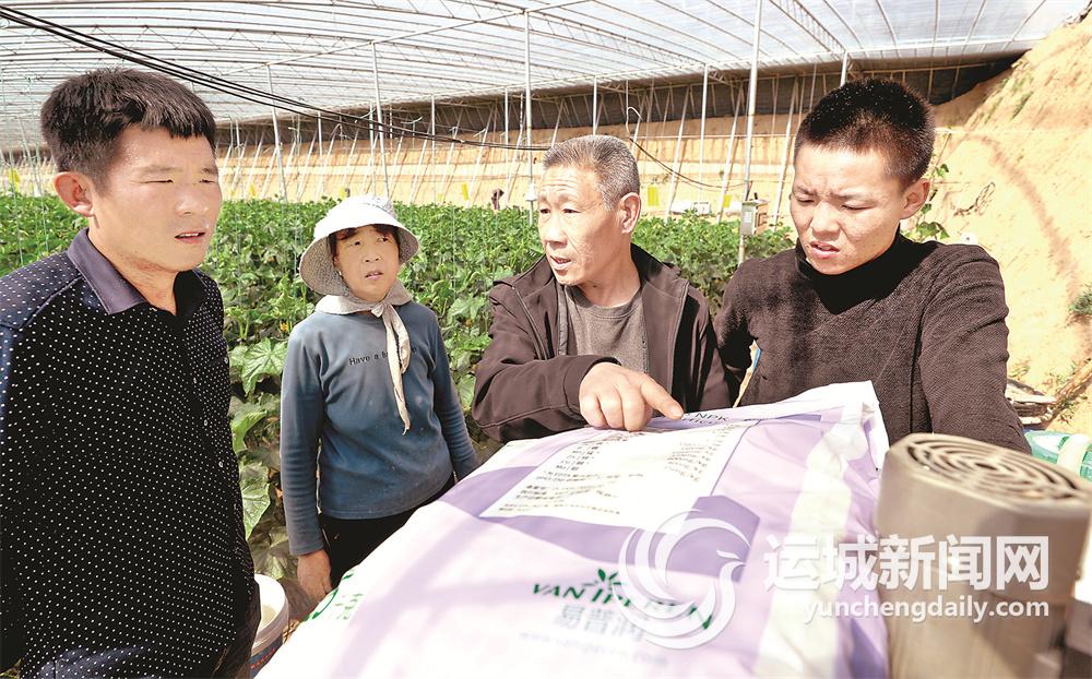 村支书曹小明(左二)走访承包户曹明生大棚,解决管理中的问题。该村“两委”成员每人包联4个大棚,协调解决种植、销售等问题。
