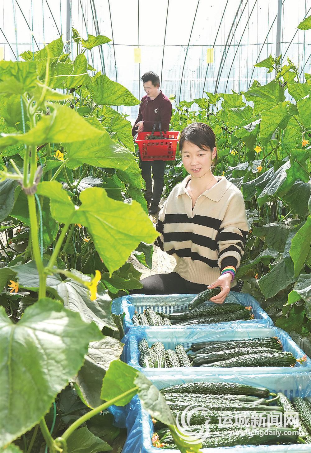 支部委员李改慧在采摘成熟的黄瓜。她去年带头承包一个蔬菜大棚,第一茬黄瓜产量达1.7万公斤,收入7.82万元。