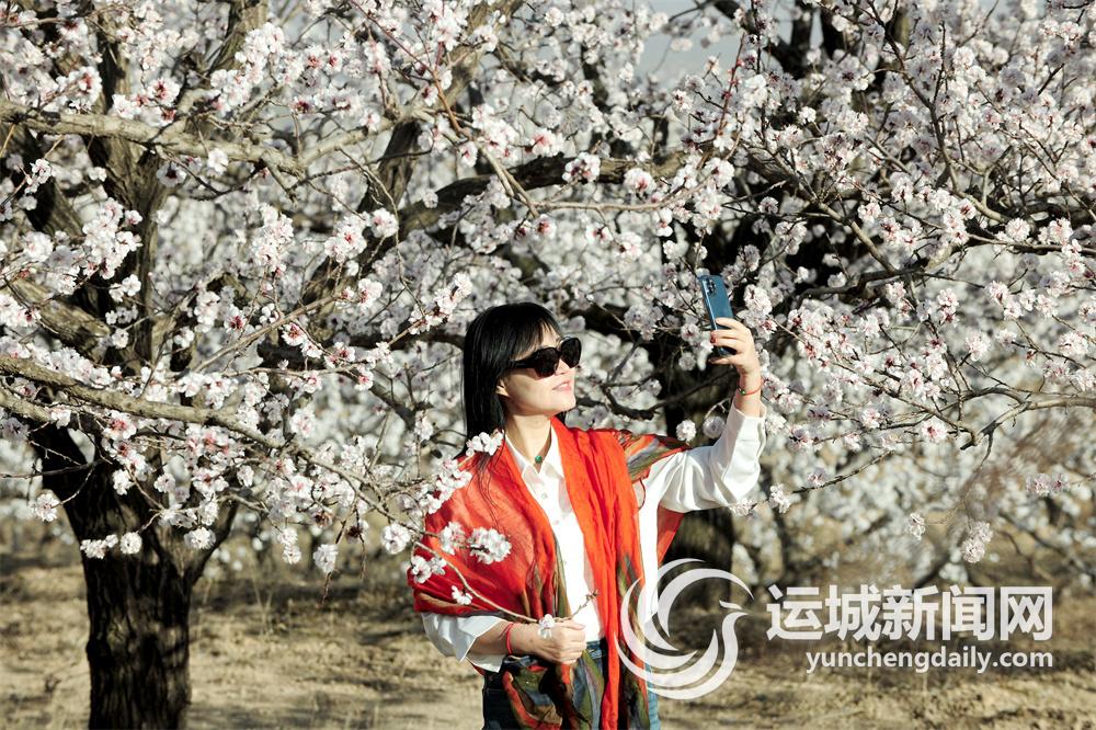 3月13日,在万荣县皇甫乡南吴村袁家,游客赏花、拍照,在杏花的清香中享受春光。