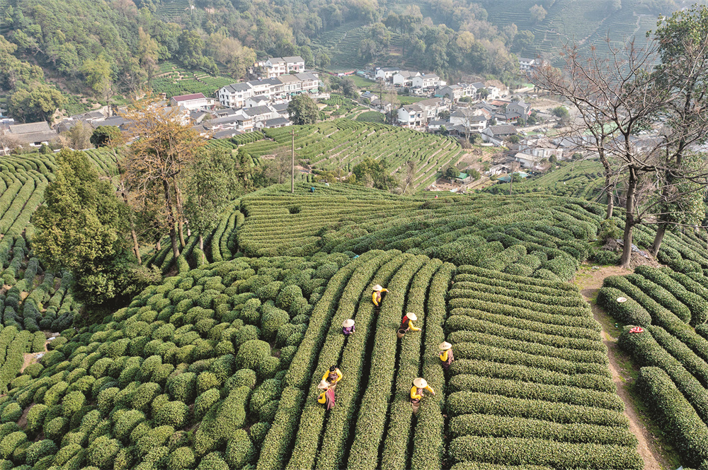 3月13日,龙井村的茶农在采摘西湖龙井“明前茶”(无人机照片)。