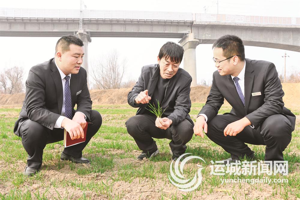 河津农商银行员工在田间地头走访了解庄稼长势。 赵雷强 摄