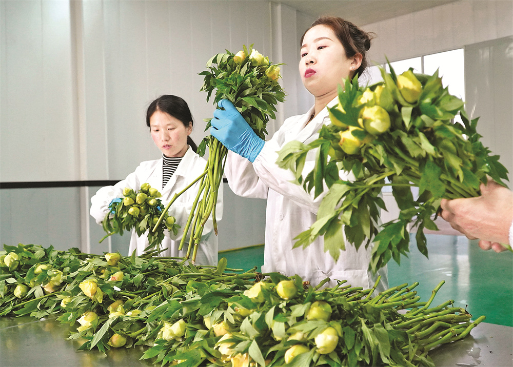 3月14日,在山东省菏泽市牡丹区黄堽镇,花农对采摘的芍药鲜切花进行分拣和包装处理。