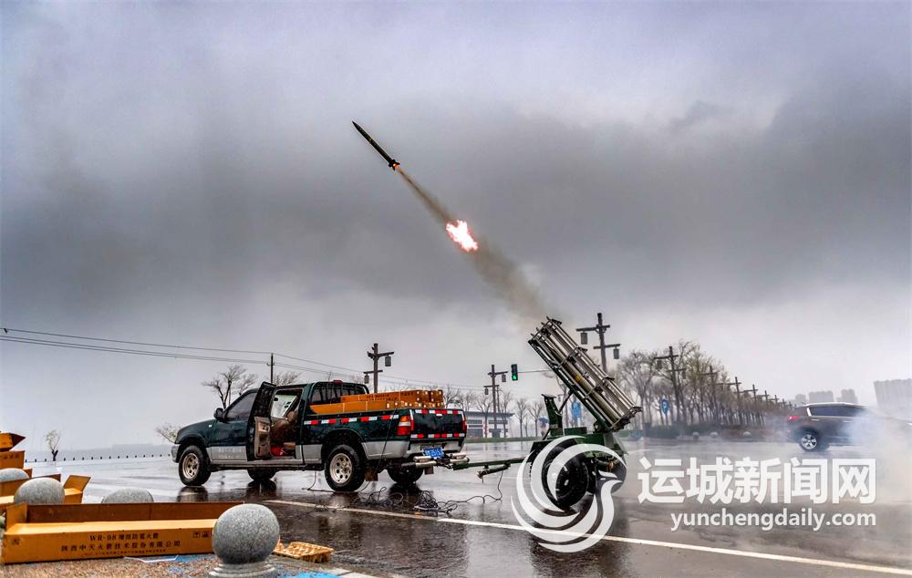 3月16日,盐湖区气象局工作人员在地面发射人工增雨火箭弹,进行人工增雨作业。