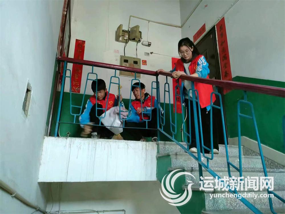 活动中,创新学校代表诵读了“传承雷锋精神·做新时代好少年”倡议书,倡议全体同学从身边小事做起,把雷锋精神带进生活的每一个角落。接着,孩子们唱响歌曲《学习雷锋好榜样》。随后,社区工作人员和孩子们一起打扫小区环境卫生、擦拭楼道栏杆、捡拾绿化带里的烟头和塑料袋等杂物(上图),为营造美丽临猗贡献力量。