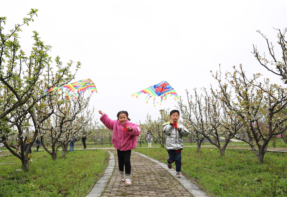 ▲3月18日,在湖南省衡阳市珠晖区茶山坳镇金甲梨园,两位小朋友在放风筝。