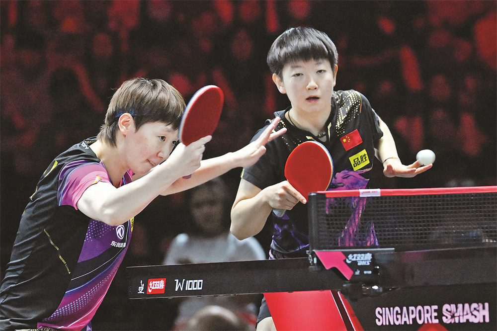3月18日,孙颖莎/王曼昱(左)在比赛中。
