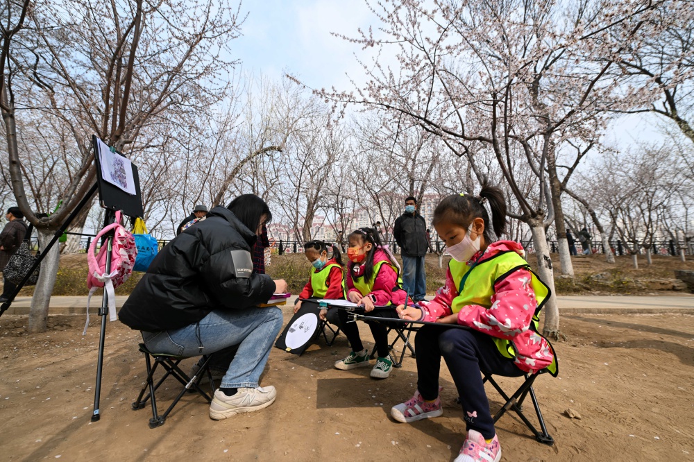 3月19日,小朋友们在天津红桥区北运河畔的桃花堤上学习画桃花。
