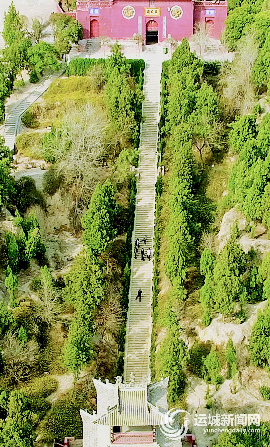 拾级再往上登,春风愈急,仰首而望,栈道宛如一条巨龙,蜿蜒通向湛蓝天边;举目四望河津全城几乎尽收眼底,远处隐隐可见汾河、黄河如带,近处一条铁路贯穿云际。看着如此景色,吹着天地间的春风,心间一片豁然,好不惬意。这里不仅是位置的高度,更是视野的高度、心灵的高度。