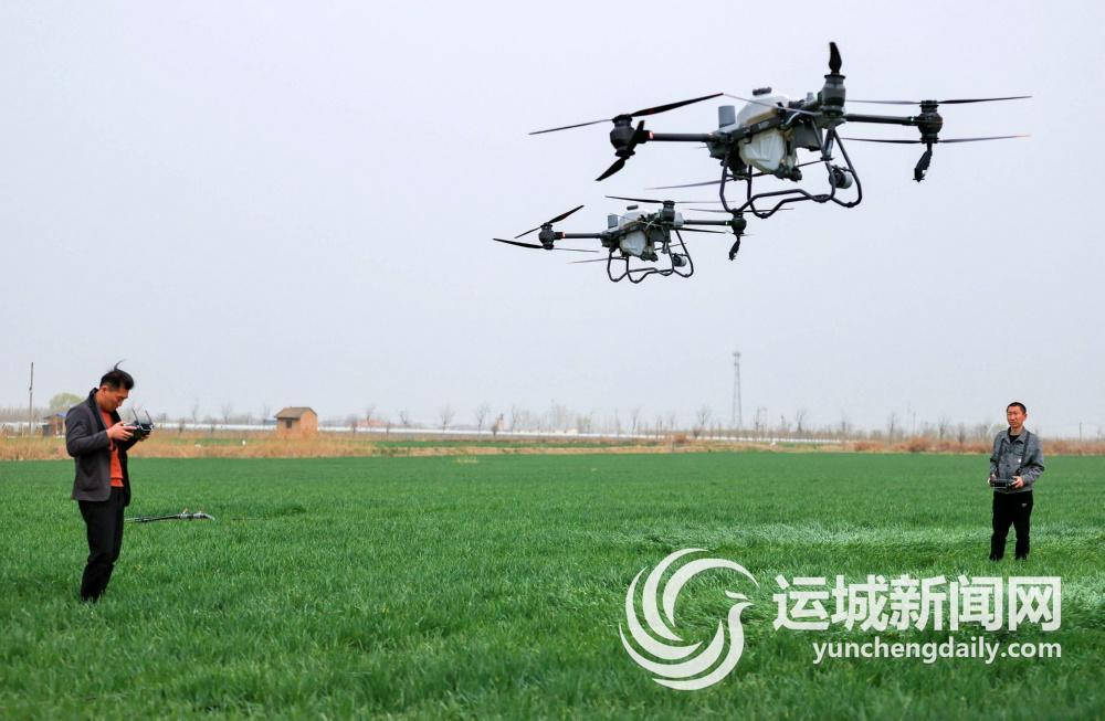 3月22日,在盐湖区金井乡一处麦田,植保人员操作无人机开展喷防作业。